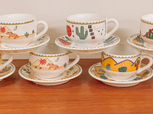 Set van 7 vintage jaren 90 Mexico stijl koffiekopjes + schotels