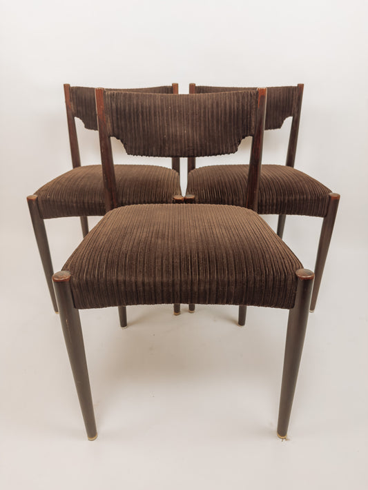 3x Vintage teakhouten eetkamerstoelen met bruine bekleding