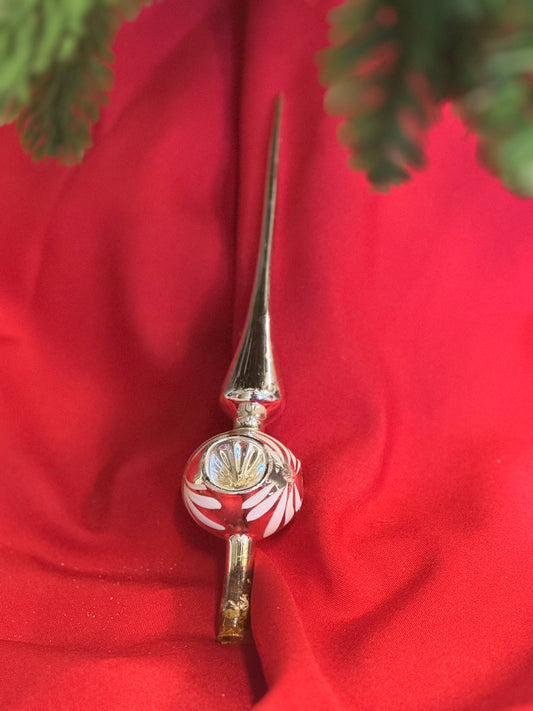 Vintage rood/zilveren glazen kerstbal met gesuikerde details