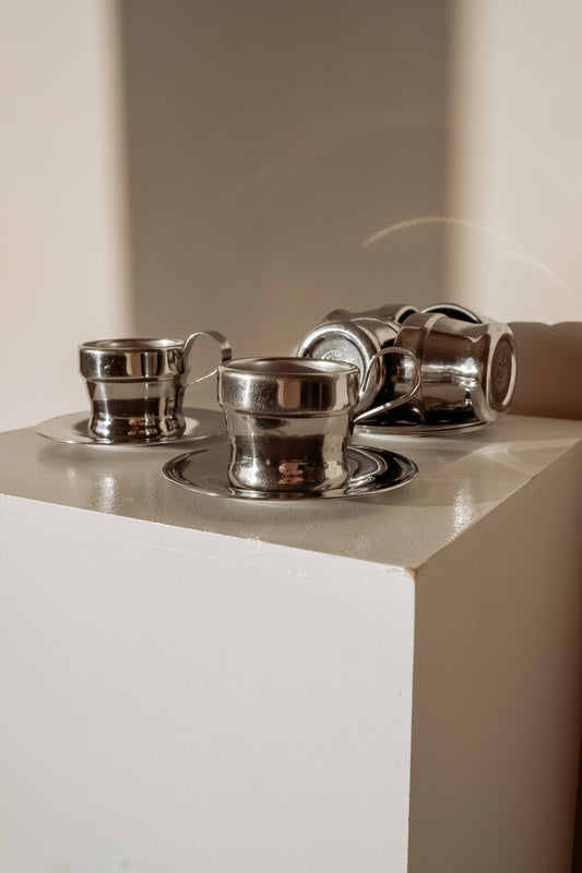 Set van 6 Italiaanse RVS espresso kopjes + schotels