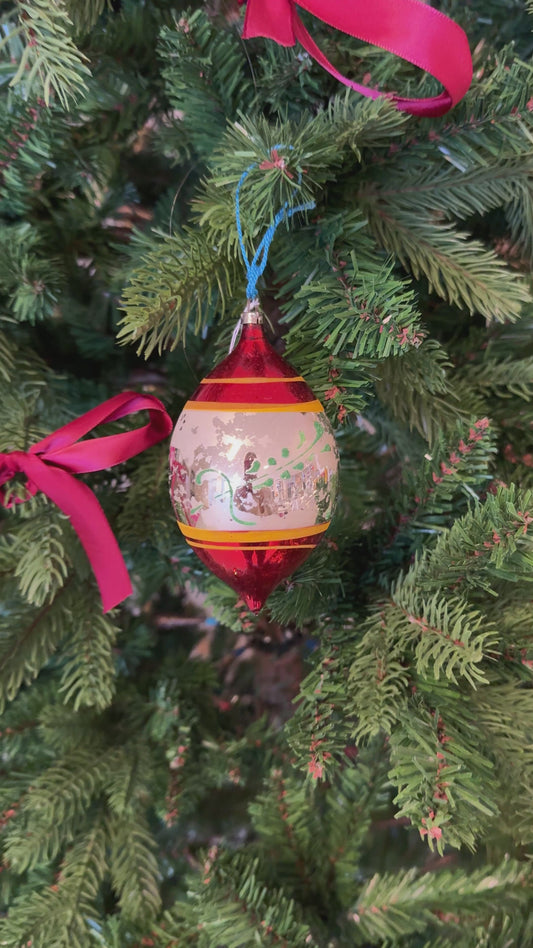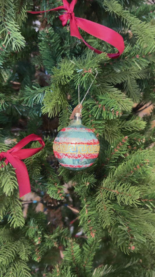 Vintage blauwe glazen kerstbal met rood gesuikerde details