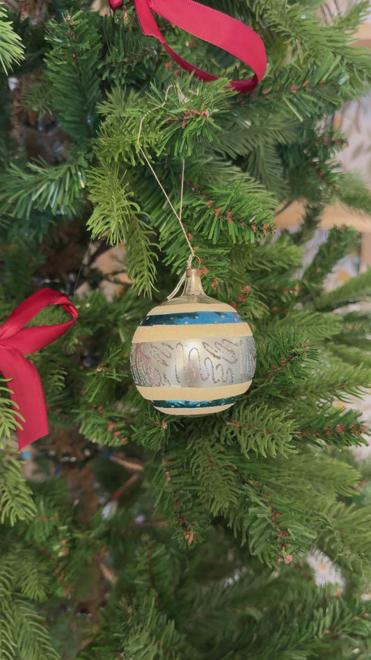 Grote handgemaakte vintage glazen kerstbal zilver/goudgeel