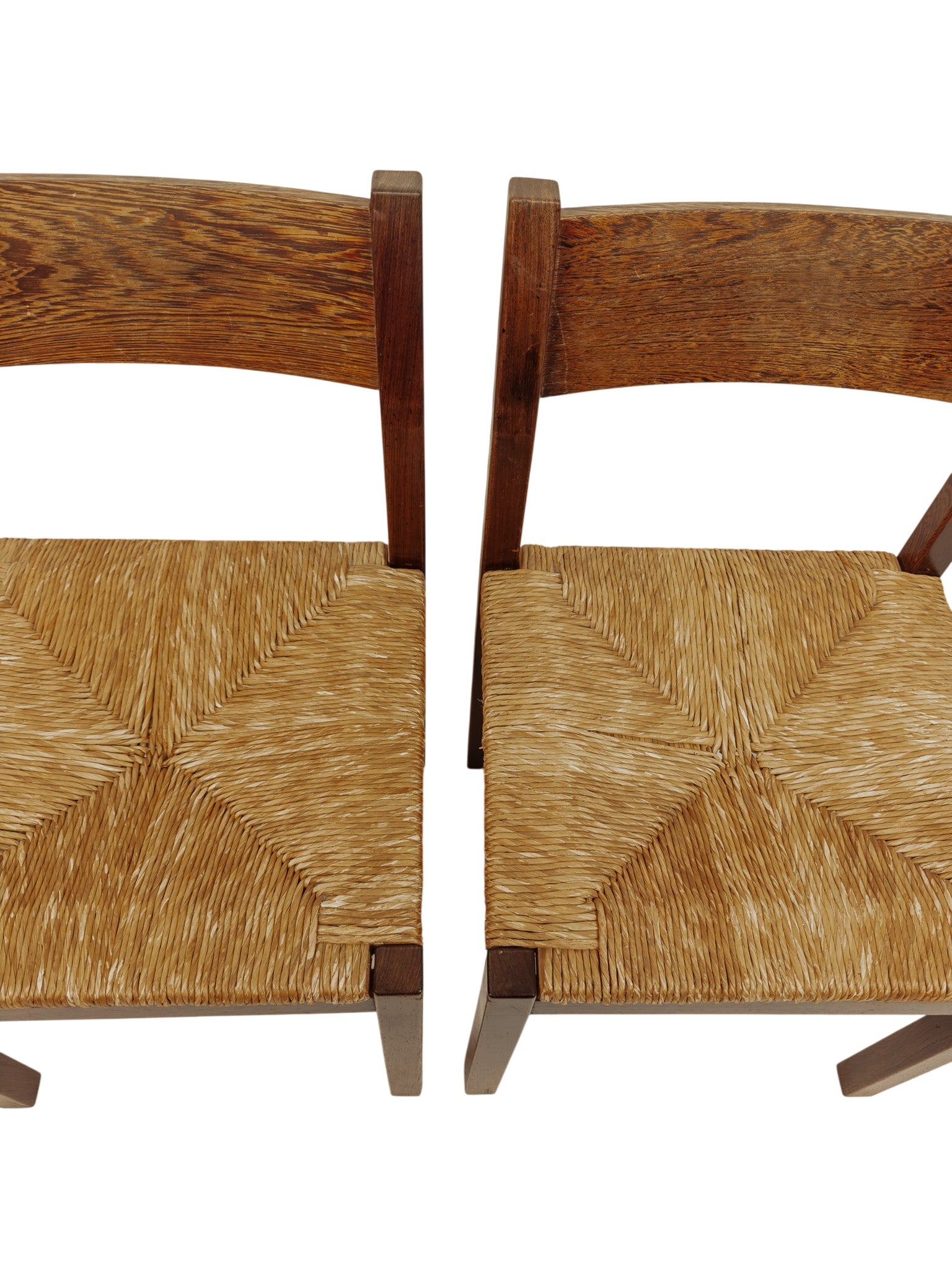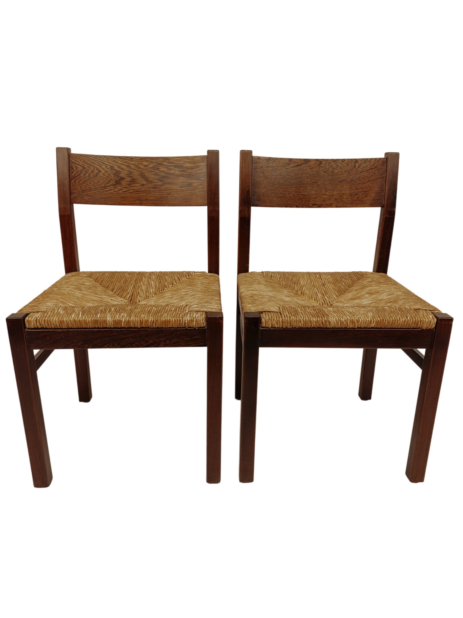 Set van twee vintage eetkamerstoelen in de stijl van Martin Visser. De stoelen zijn van massief wengé hout, met een gevlochten biezen zitting. In uitstekende conditie.