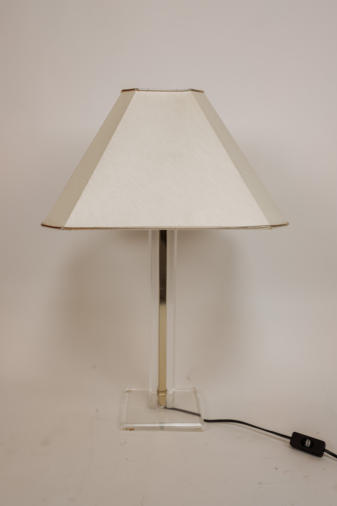 Doorzichtige vintage plexiglas tafellamp met messing details. Deze jaren 80 lamp komt met een 8-hoekige cremekleurige kap. Geeft onwijs mooi sfeerlicht door de verschillende hoeken in de kap. Het is een lekker groot formaat lamp (hoogte 65cm). Wat nauwelijks opvallende gebruikssporen, maar verder in uitstekende conditie!