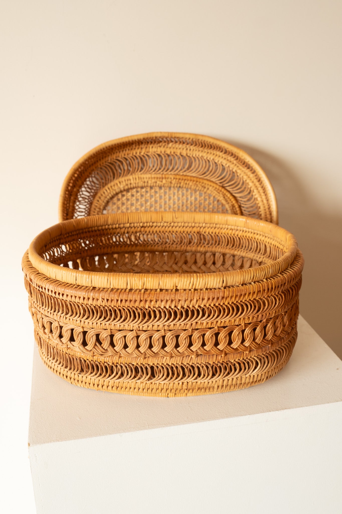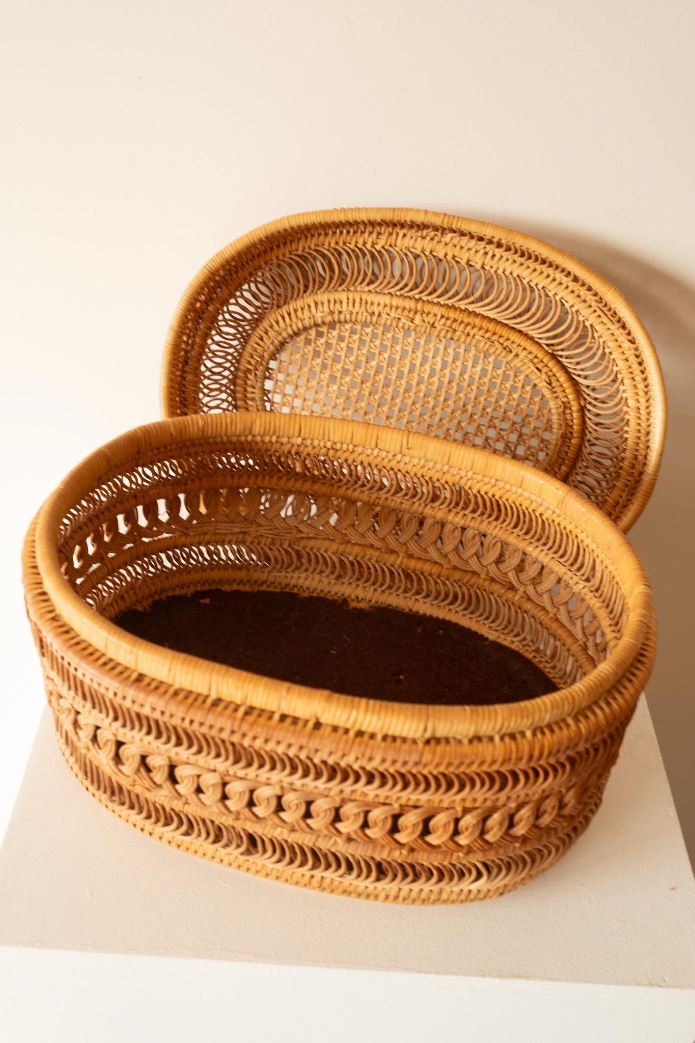 Prachtig gedetailleerde rieten mand met bijpassende deksel in ovale vorm. Ideaal voor het opbergen van kleine spulletjes of bijvoorbeeld in de keuken om fruit of groente in op te bergen.