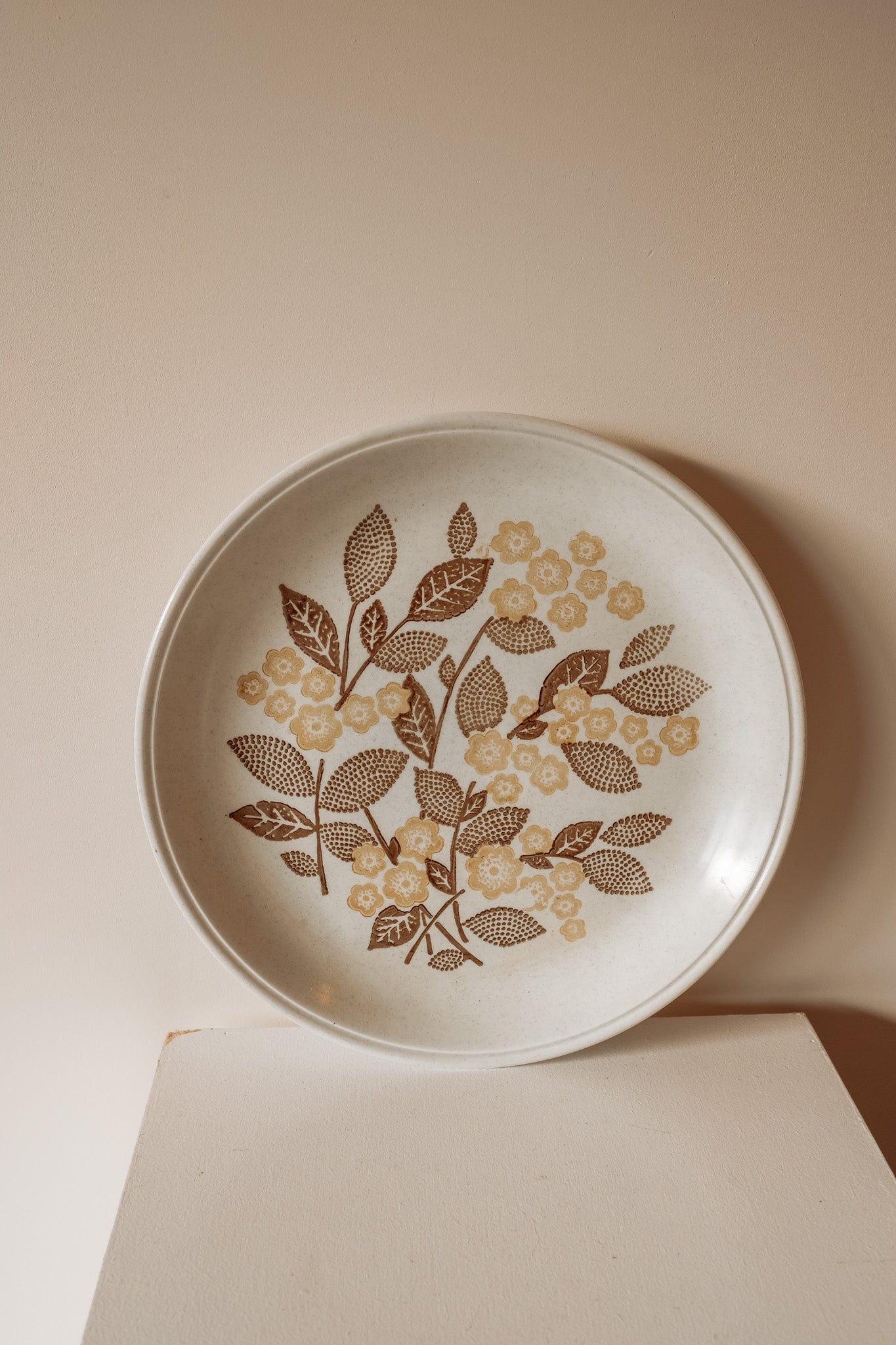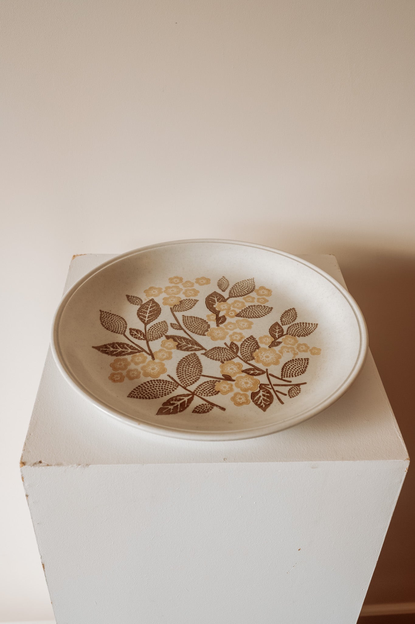 Grote keramieken bord/serveerschaal met bruin gebloemd patroon. Gemaakt in Engeland in de jaren 70. In perfecte conditie!