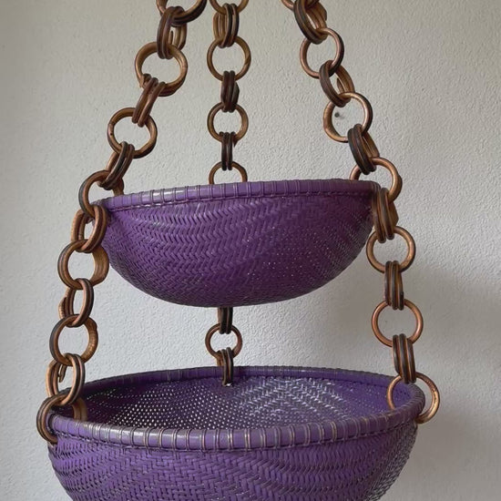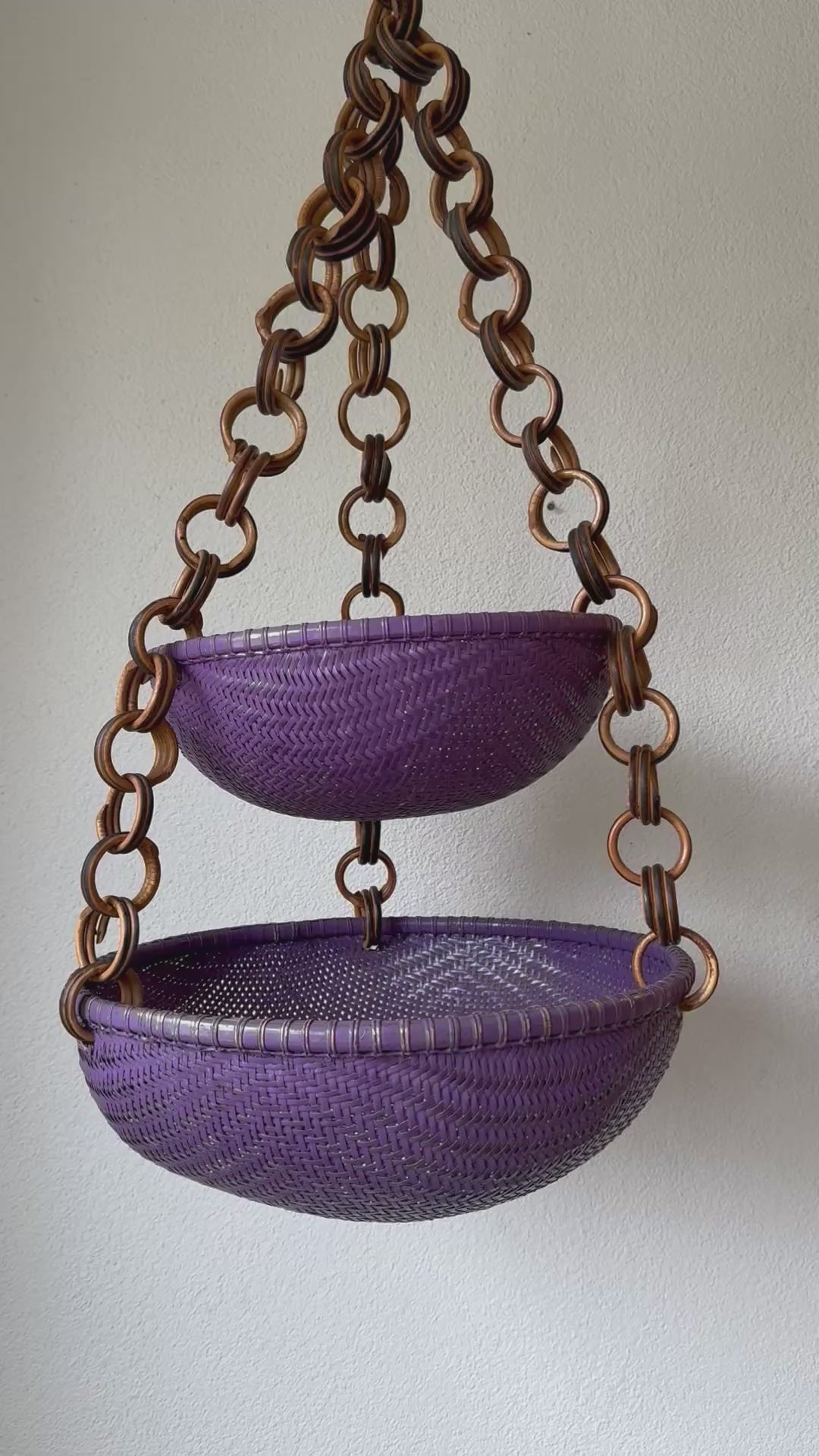 Crazy bowl with handle on beaten copper legs. Very nice as a reading basket or next to the fireplace to store firewood.