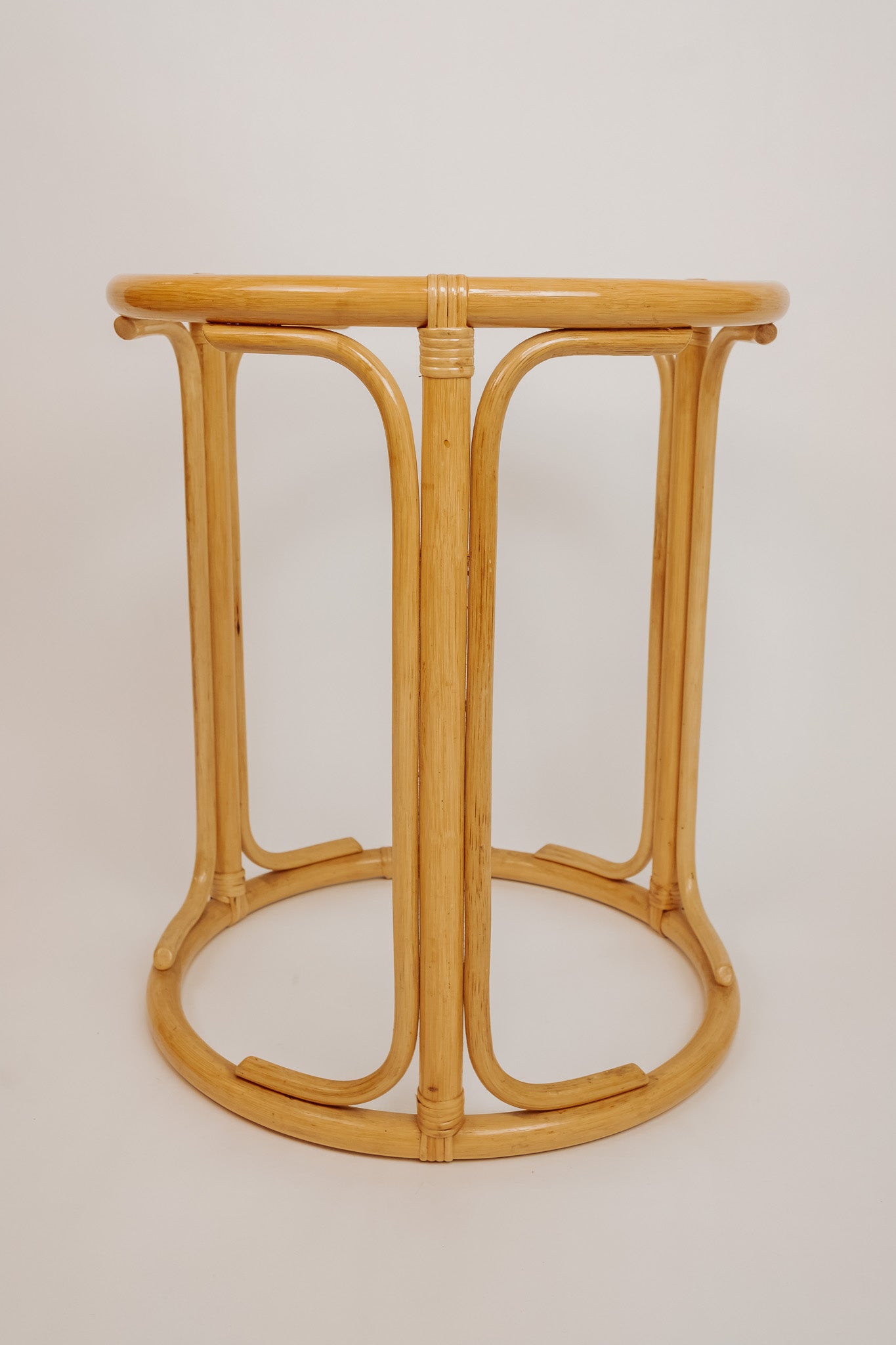 Ronde bijzettafel uit de jaren 80 van stevig bamboe met een glazen blad. In nagenoeg perfecte conditie!