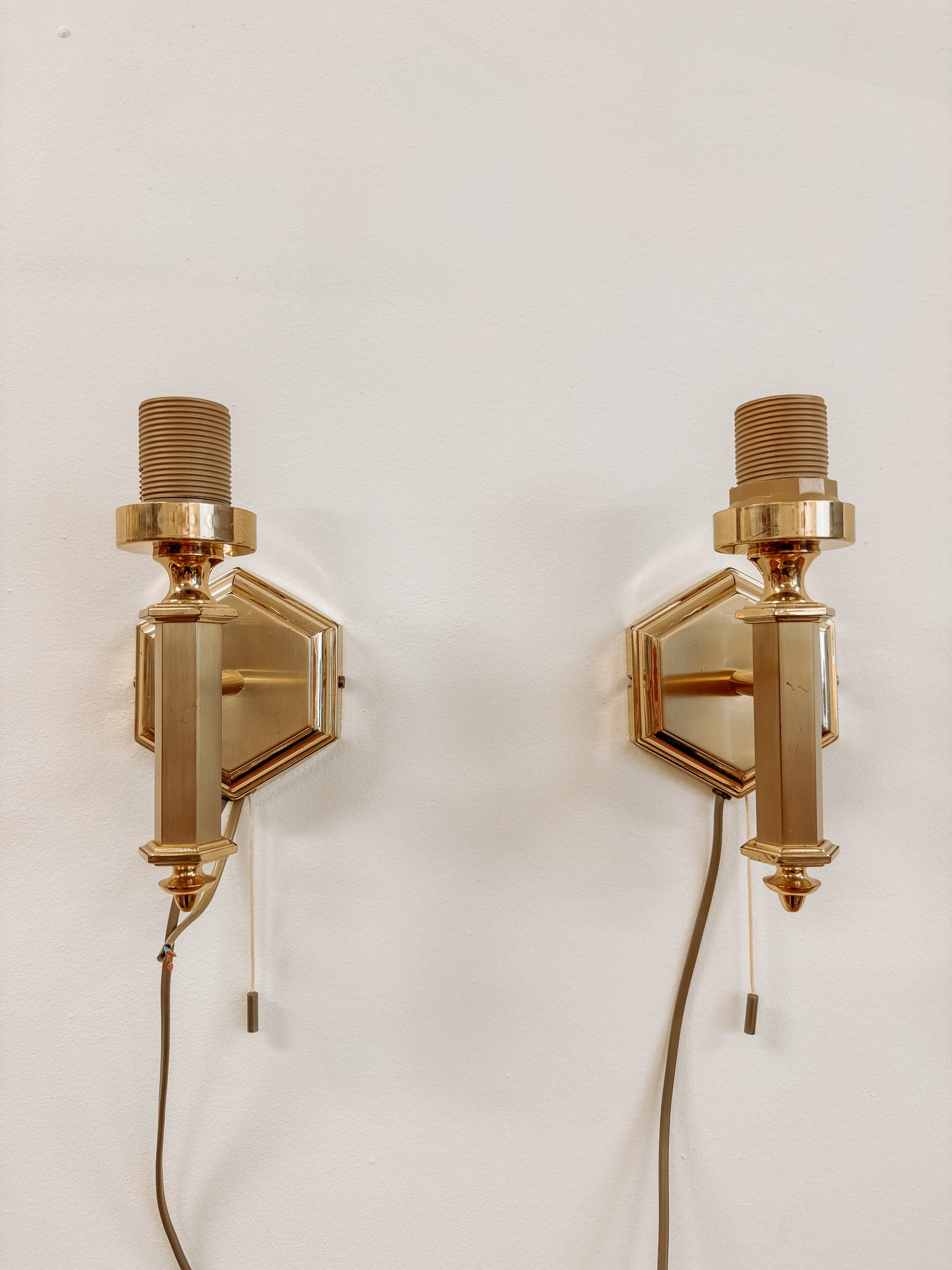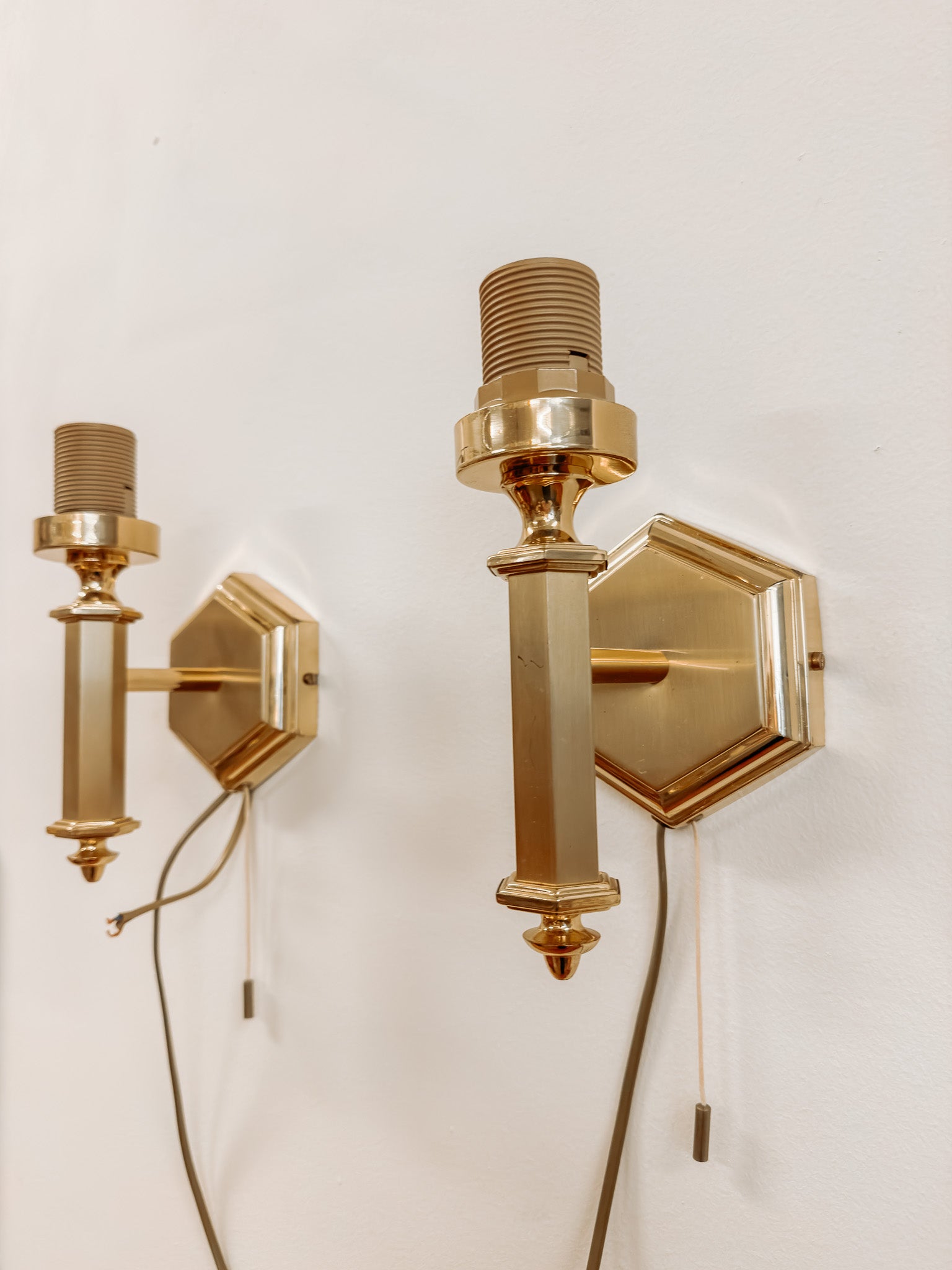 Set van 2 Hollywood Regency stijl wandlampjes in gecombineerd glanzend en mat messing. De lampjes hebben een trektouwtje om de lamp aan en uit te doen, dus zijn ideaal als nachtlampjes naast je bed. Je kan de lampjes gebruiken met een kap erop, of gewoon met een mooie gloeilamp erin. De lampjes hebben geen stekker, dus kunnen of direct aan een lichtpunt aangesloten worden met een kroonsteentje, of je zou een stekker kunnen toevoegen.