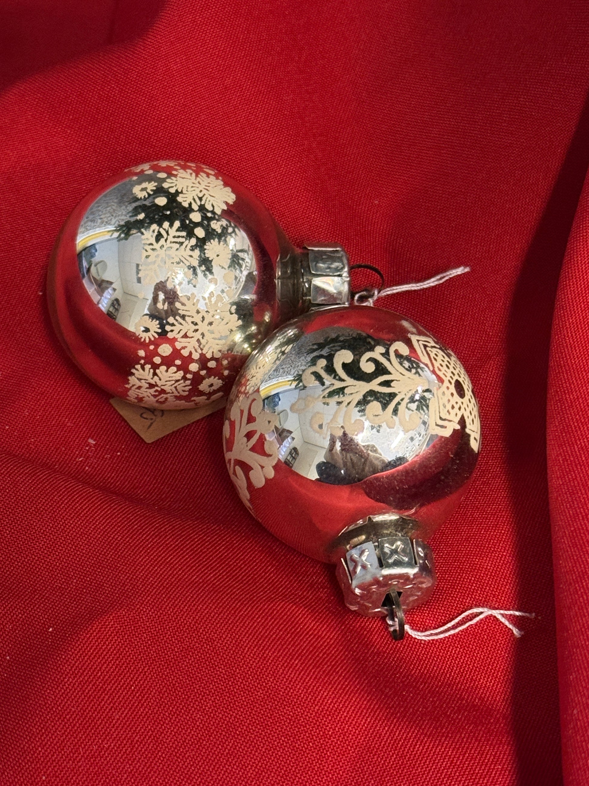 Set van 2 prachtige mondgeblazen vintage zilveren kerstballen met handbeschilderde sneeuwvlokjes. Circa 6x5cm per kerstbal