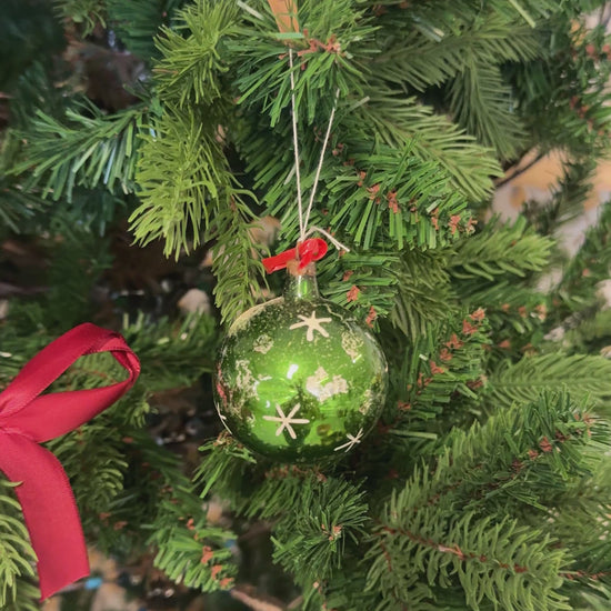 Vintage groene glazen kerstbal met handbeschilderde sterretjes. 6x5cm