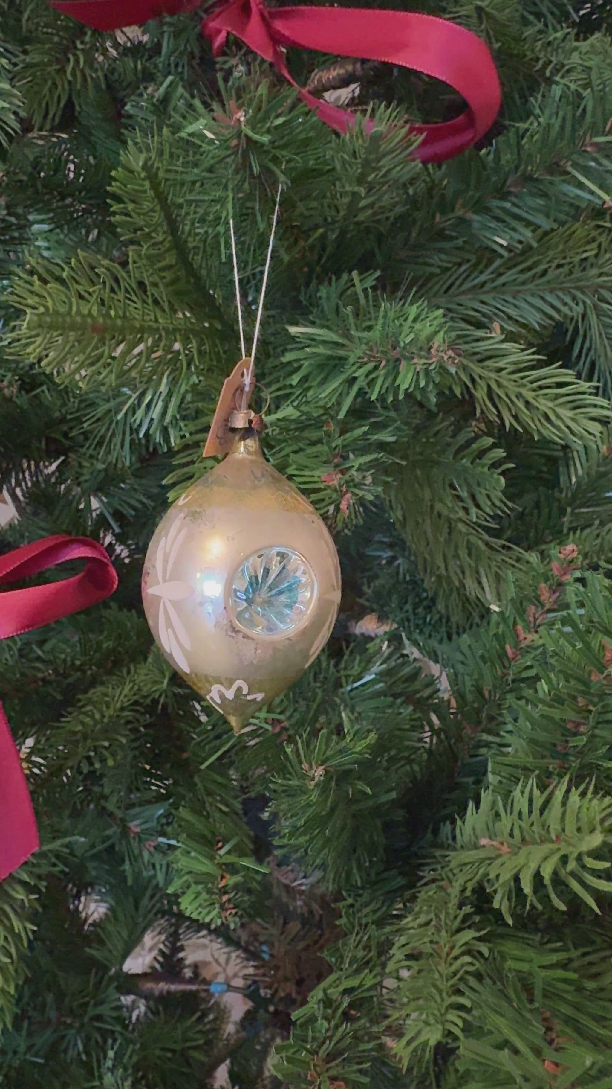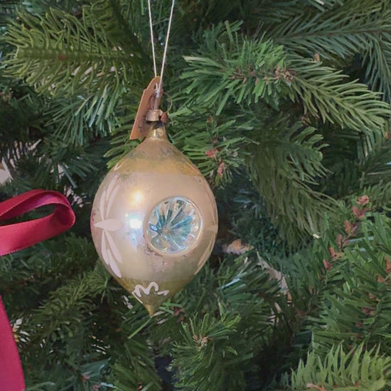 Prachtige handgemaakte vintage kerstbal pegel met 3 deuken rondom. 7x5cm