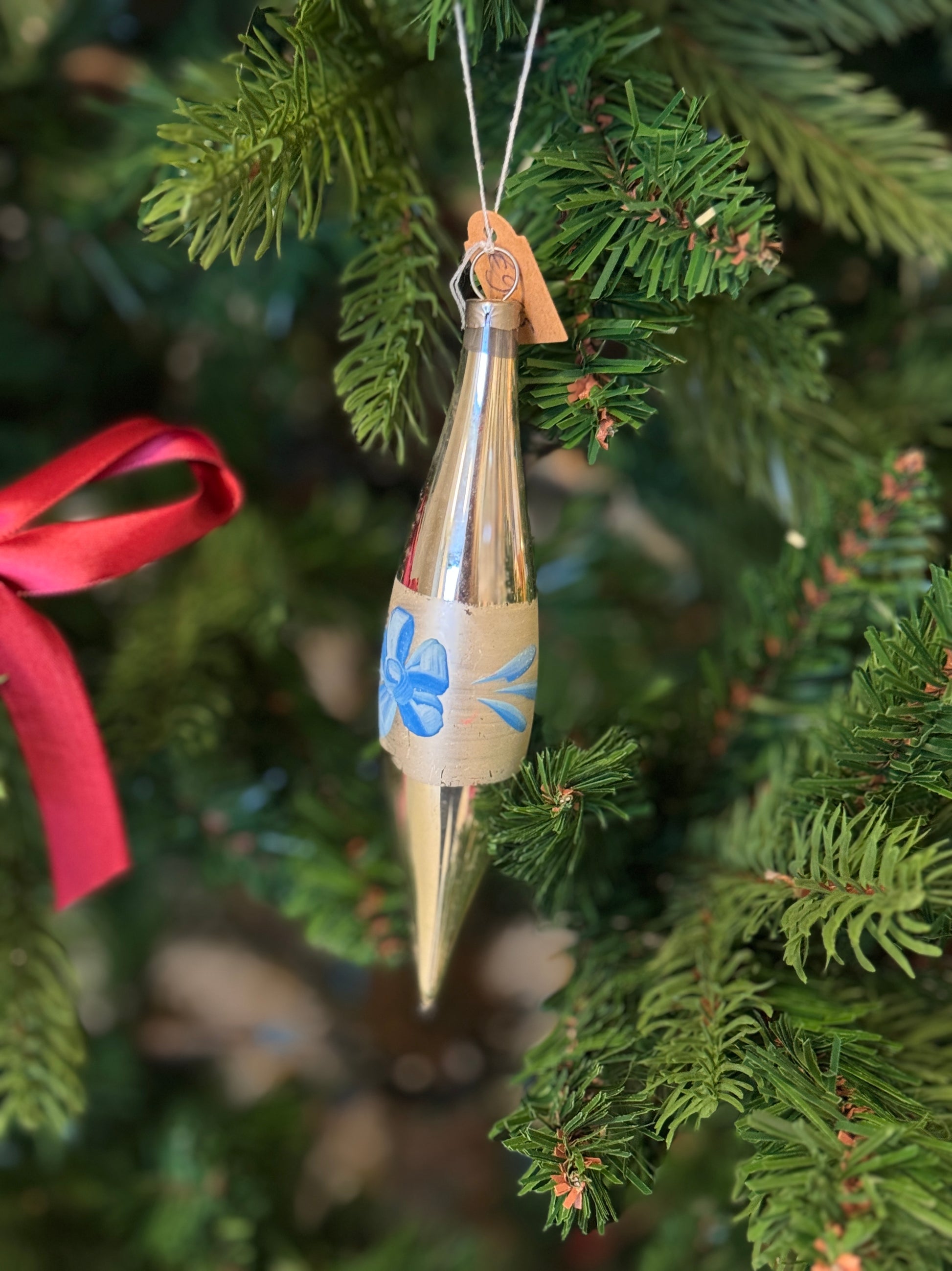 Prachtige handgemaakte vintage kerstbal pegel zilver met handbeschilderde blauwe bloemen. 14x3cm