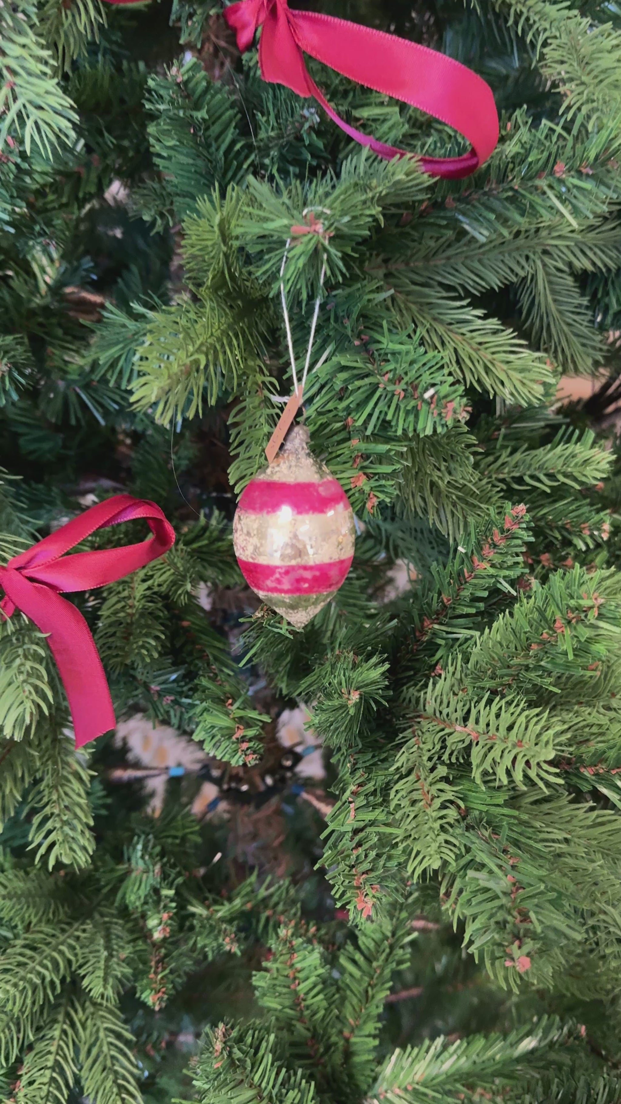 Prachtige zilveren vintage kerstbal pegel met handbeschilderde roze details. 6,5x4,5cm