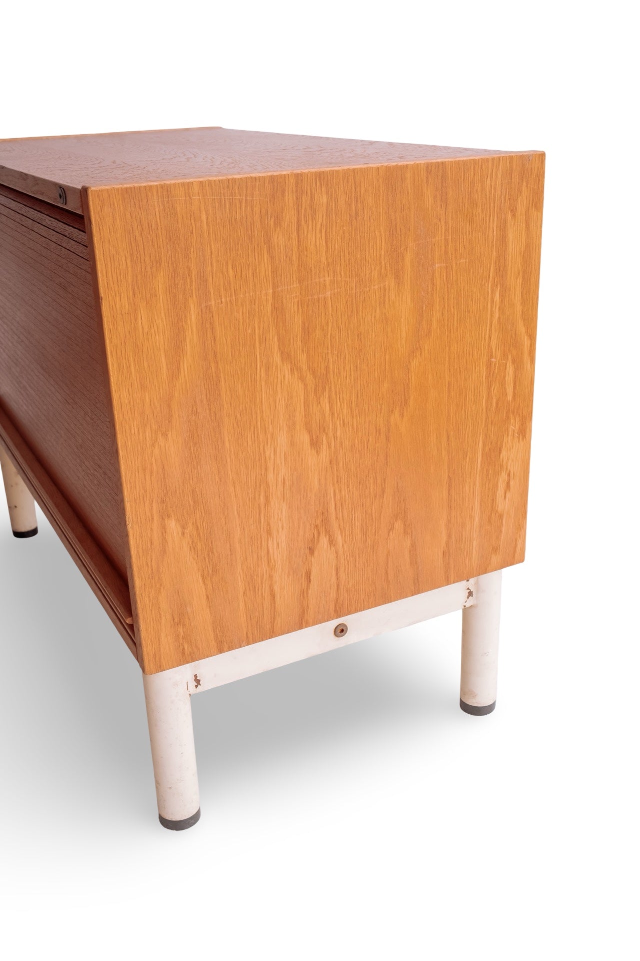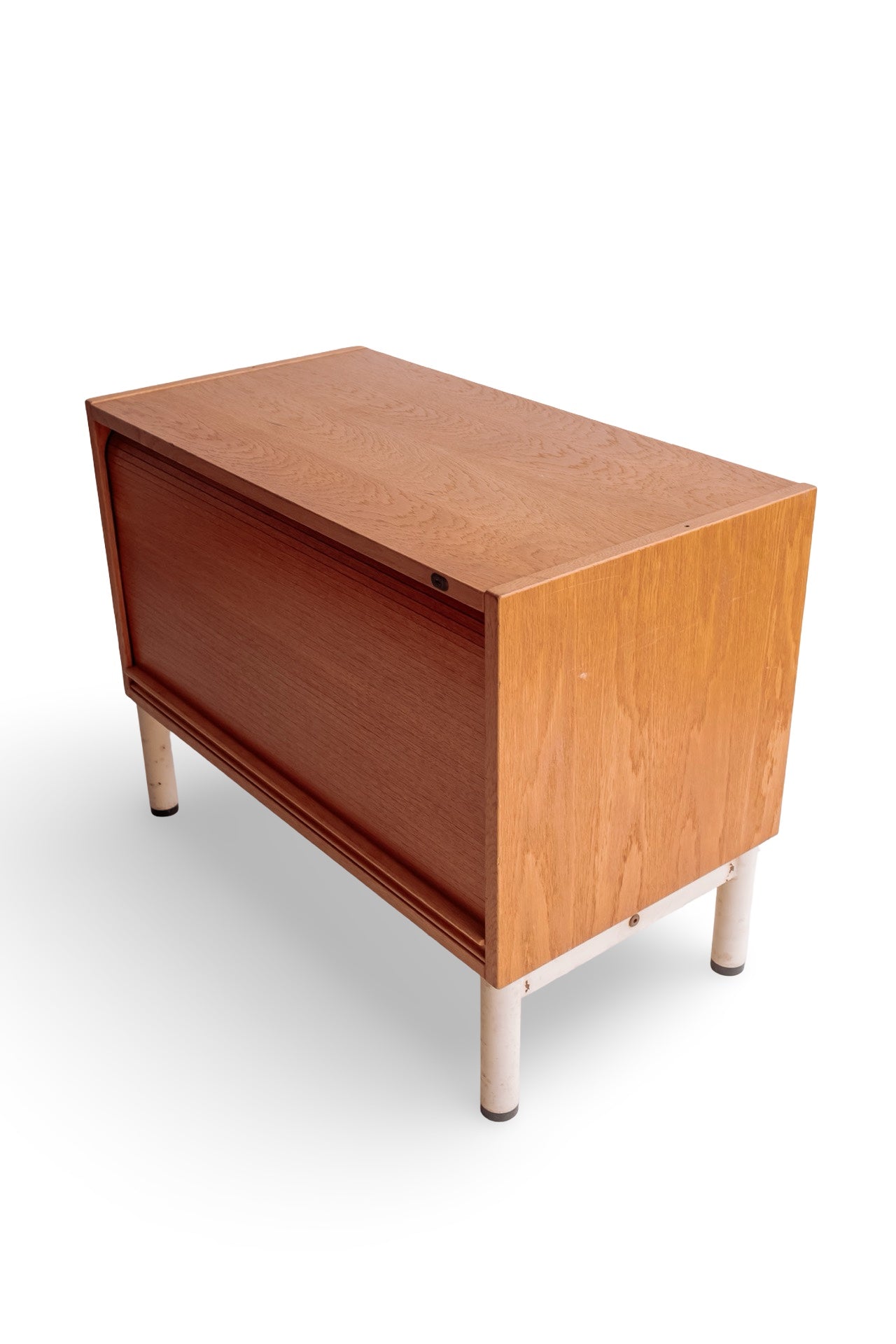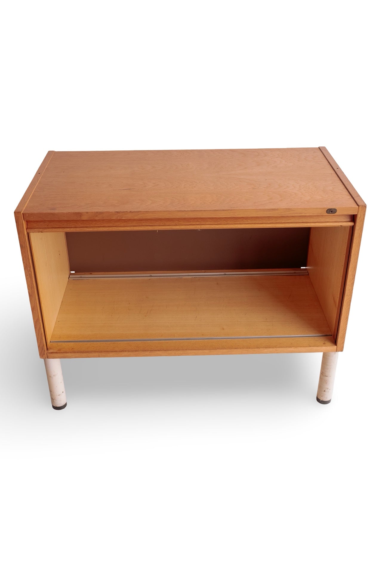 Licht houten roldeur kastje met wit stalen onderstel. In super mooie conditie en het deurtje rolt ook heel soepel. Alleen wat verweerde plekken op het witte onderstel. Het hout is nog prachtig. Ideaal als tvmeubel bijvoorbeeld.
