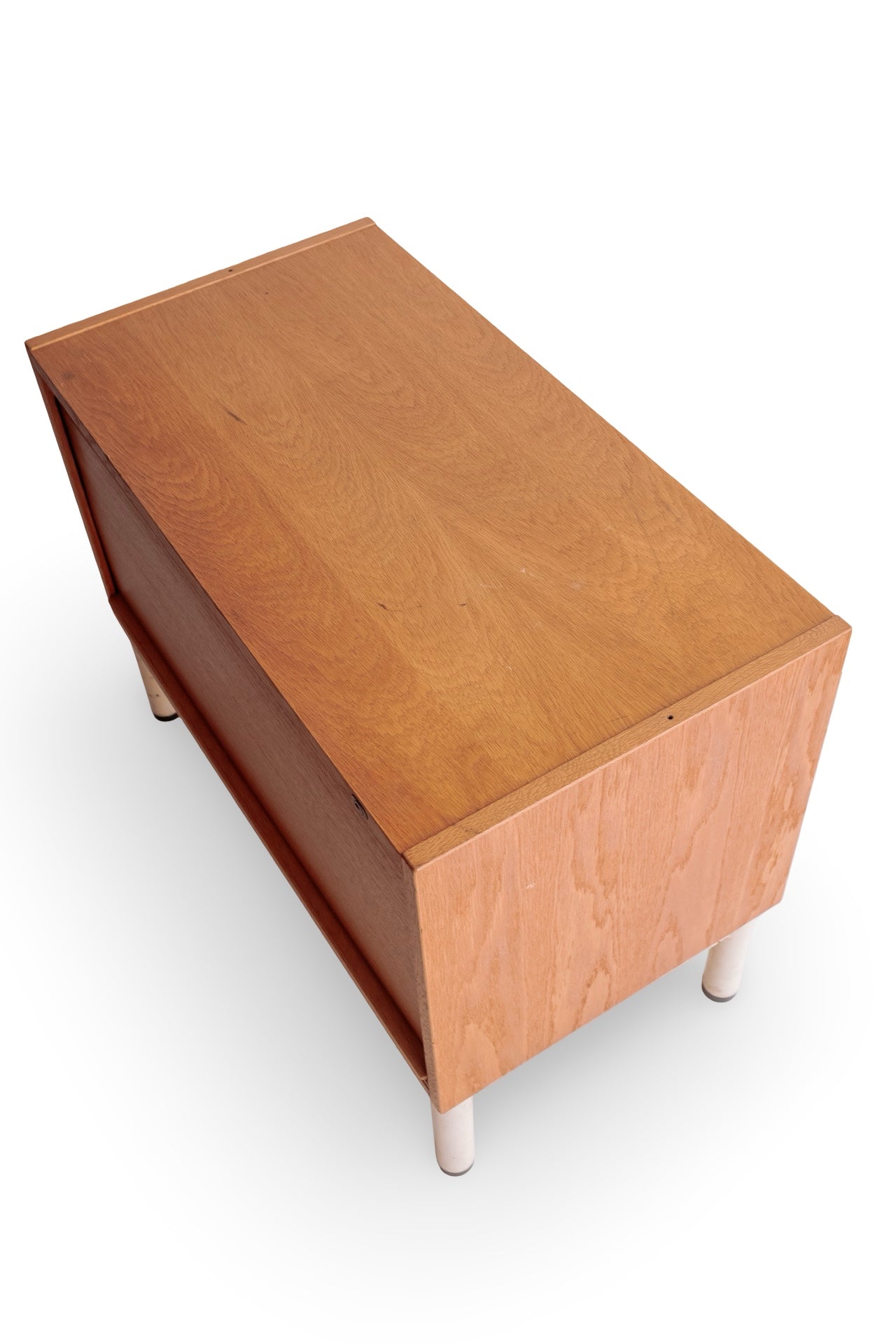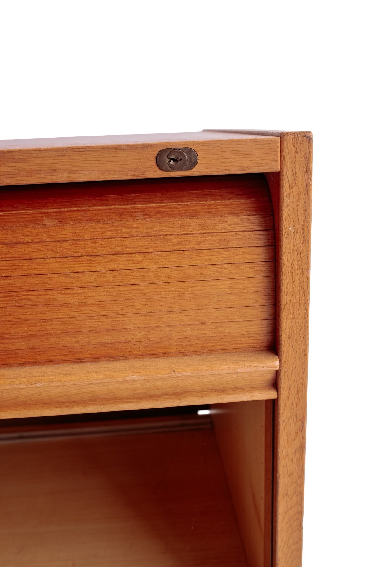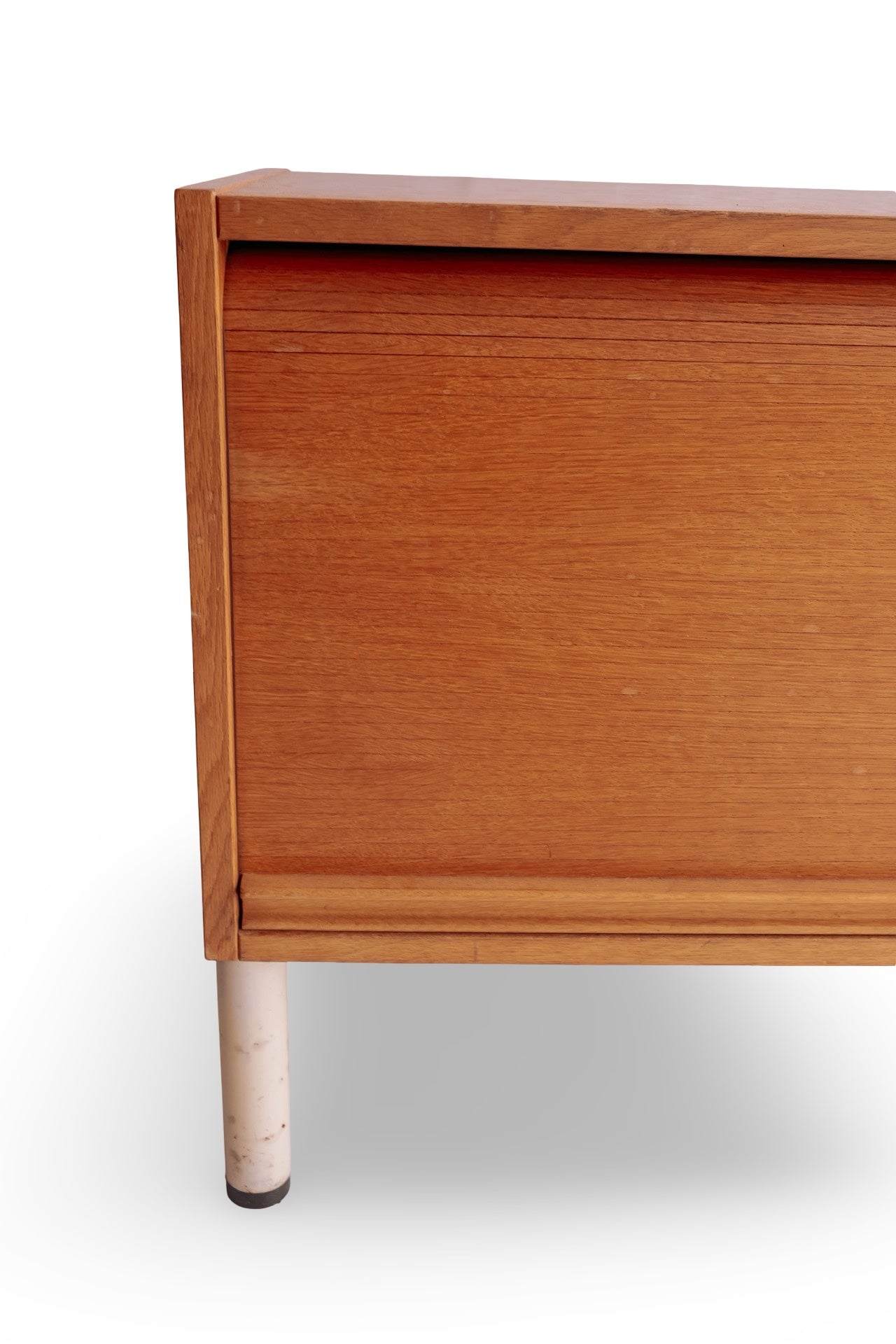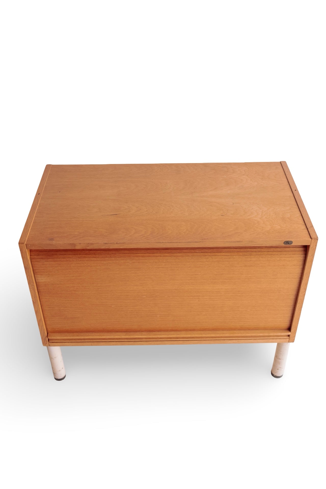 Licht houten roldeur kastje met wit stalen onderstel. In super mooie conditie en het deurtje rolt ook heel soepel. Alleen wat verweerde plekken op het witte onderstel. Het hout is nog prachtig. Ideaal als tvmeubel bijvoorbeeld.