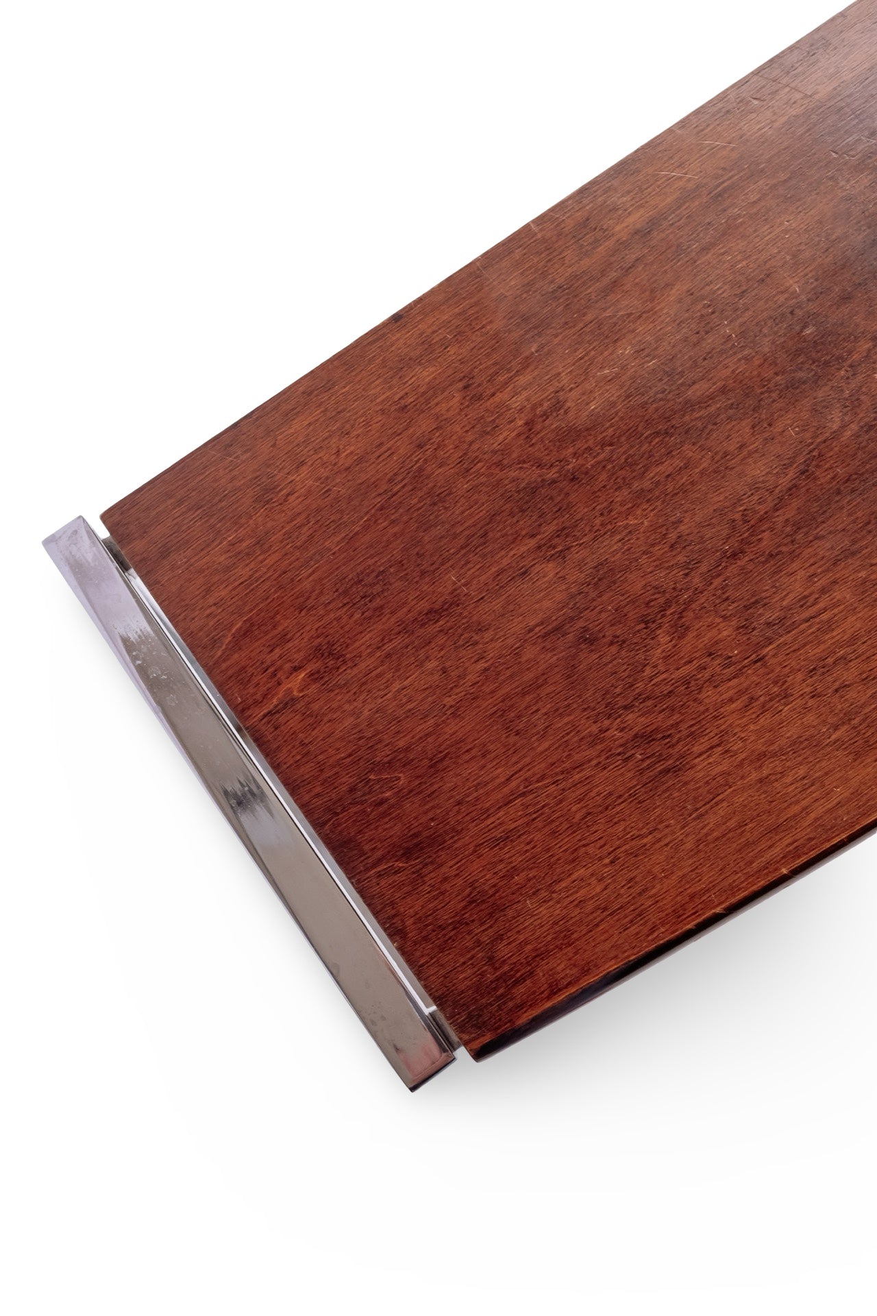 Vintage sidetable met chromen frame en zwevend houten blad
