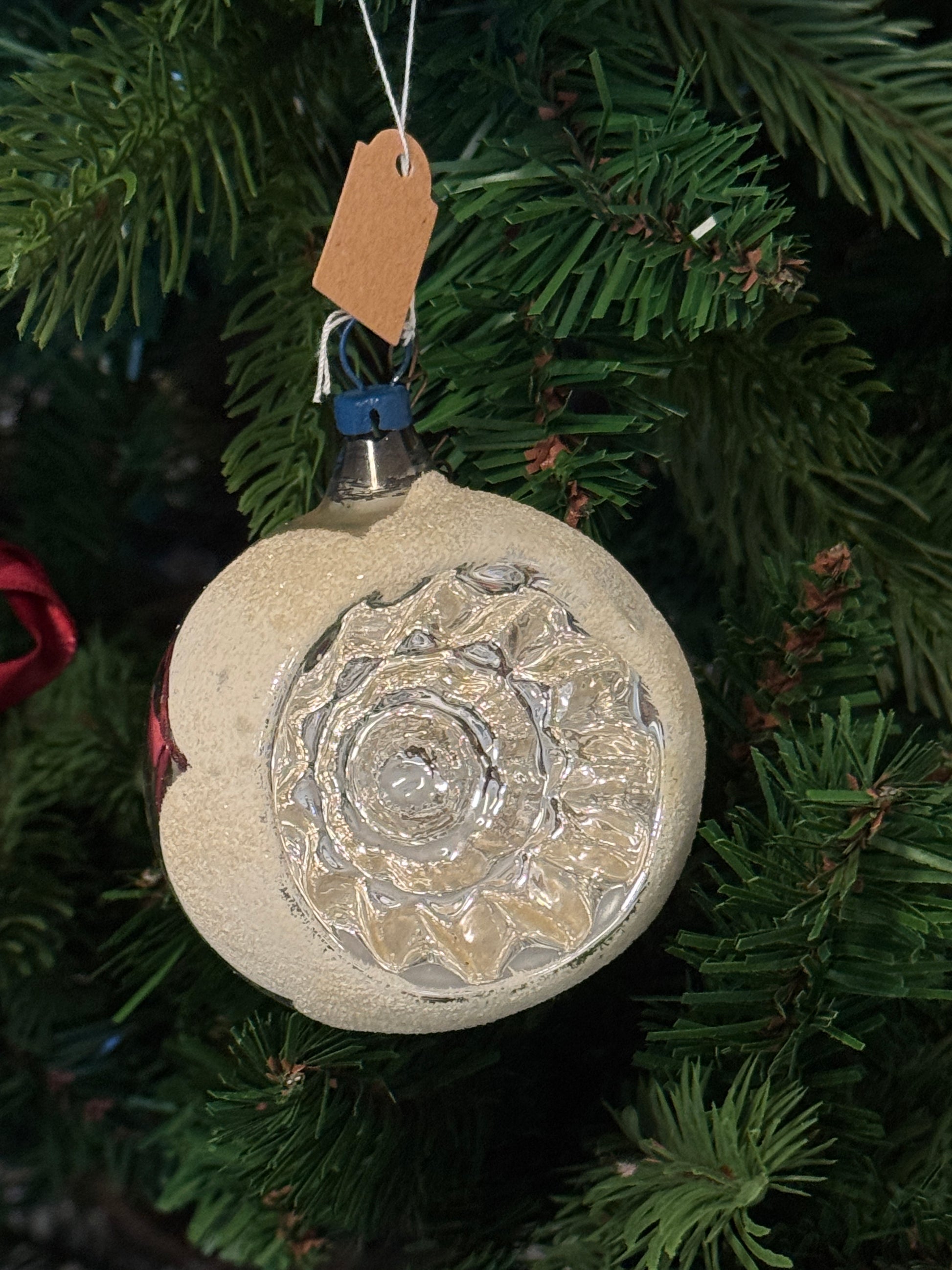 Vintage grote zilver deuk kerstbal met gesuikerde rand. 6,5x7,5cm