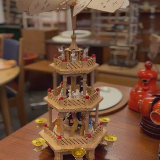 Prachtige houten kerstpiramide van drie levels met kaarsjes. Door de warmte draait hij rond en krijg je een prachtig mooi schouwspel te zien, te gezellig op tafel tijdens de kerstdagen. In uitstekende conditie, de bijpassende rode kaarsen worden meegeleverd.