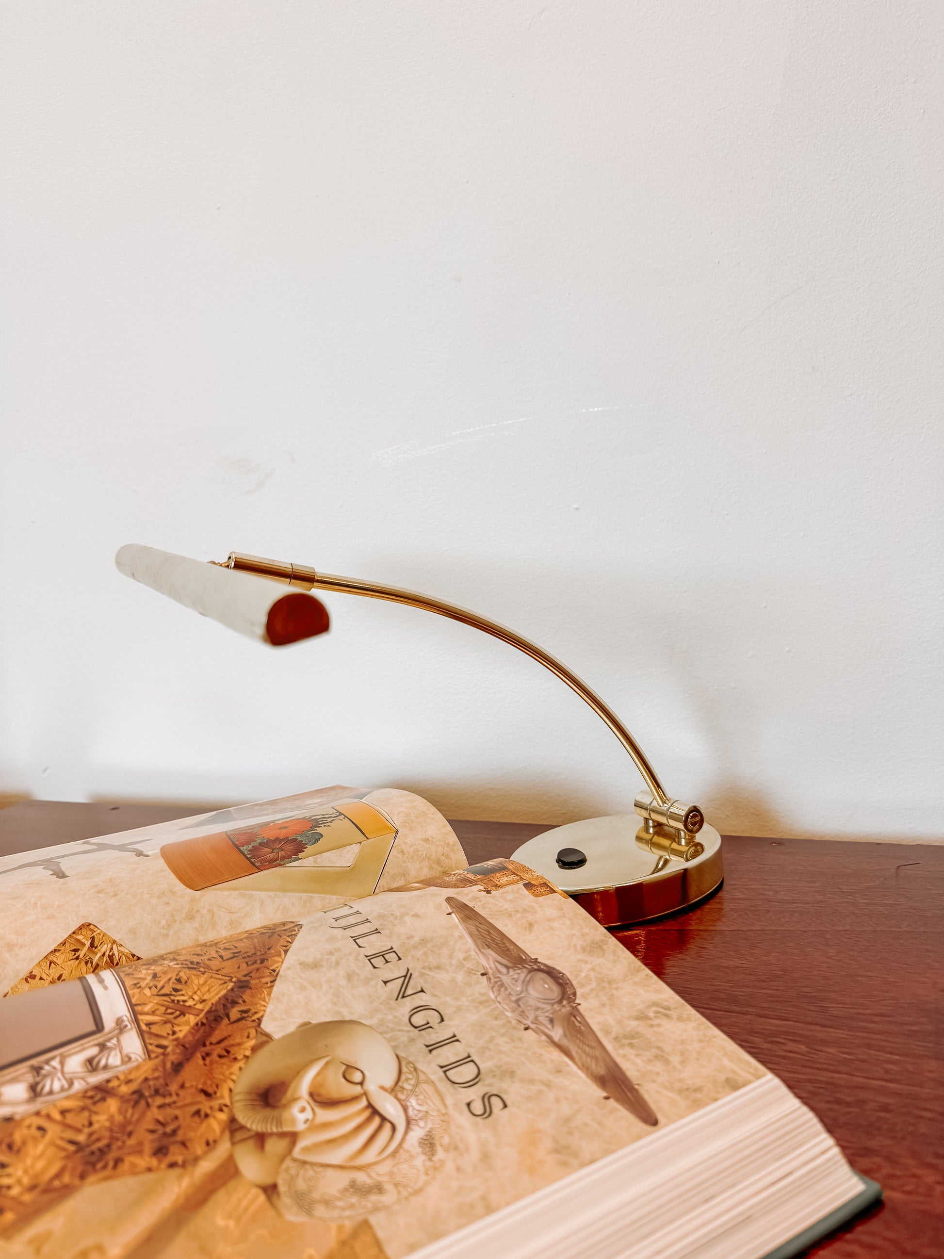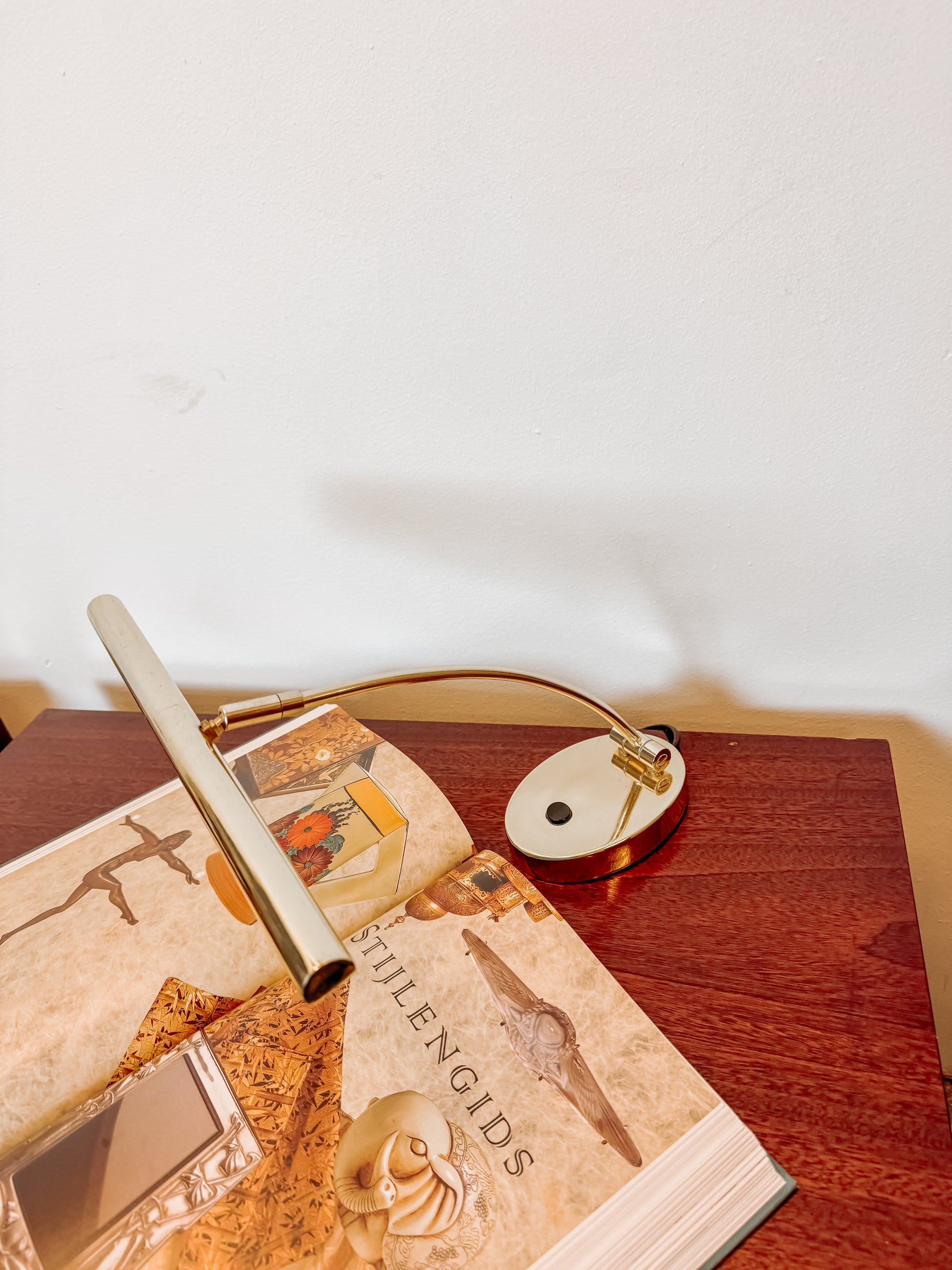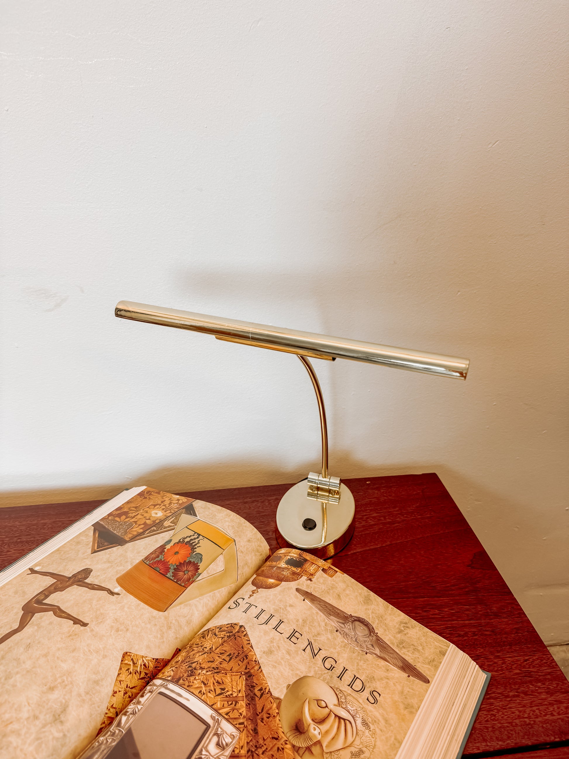 Prachtig messing leeslampje of pianolampje van glanzend messing. Zowel de armatuur als de lamp is kantelbaar. Perfect om bijvoorbeeld een koffietafelboek uit te lichten. Wordt geleverd met de bijbehorende led lampjes.