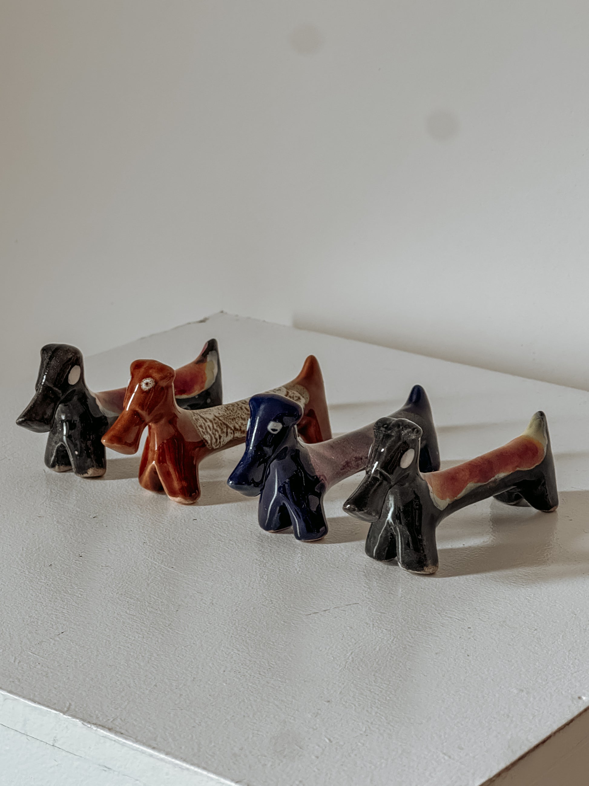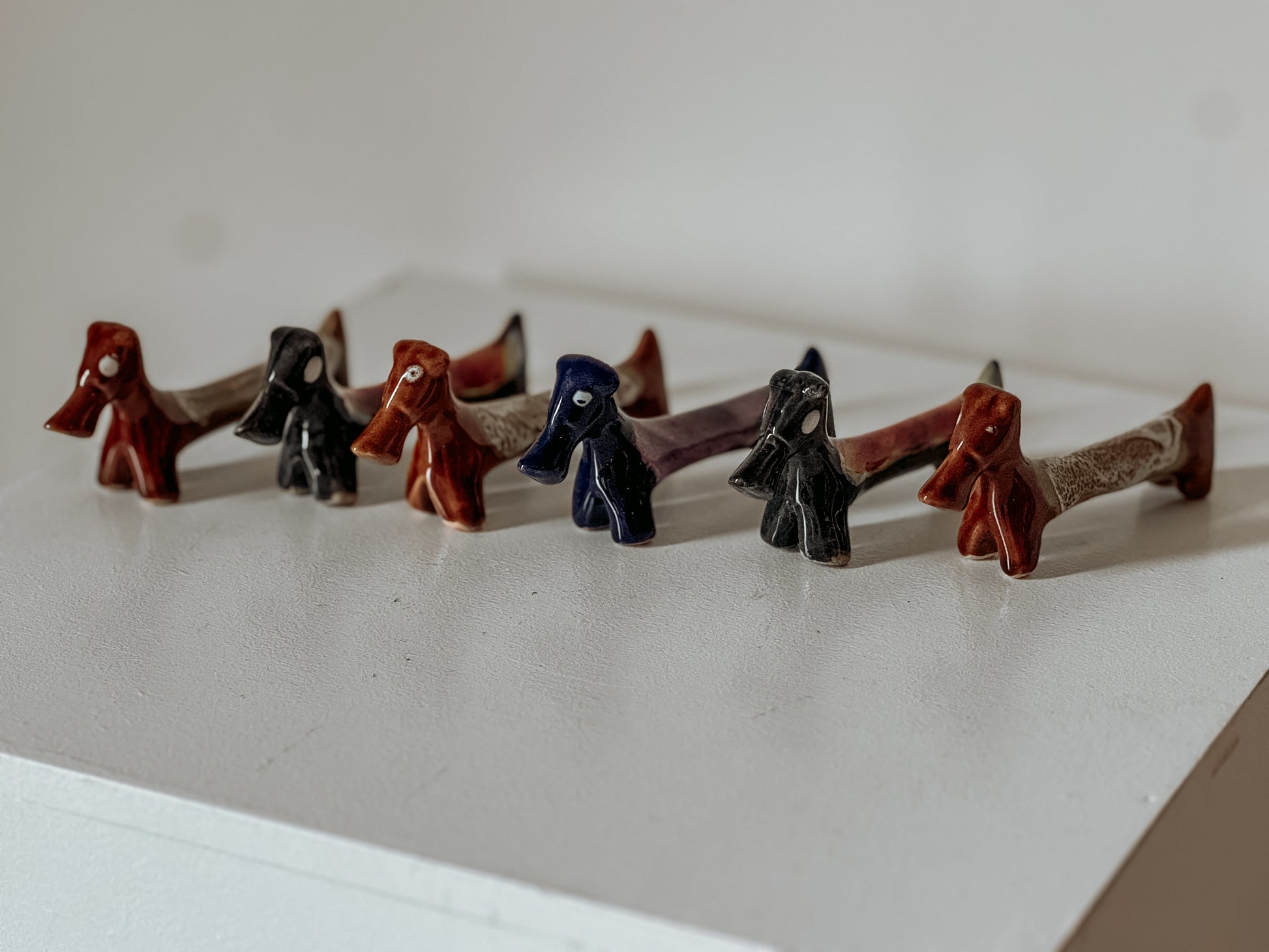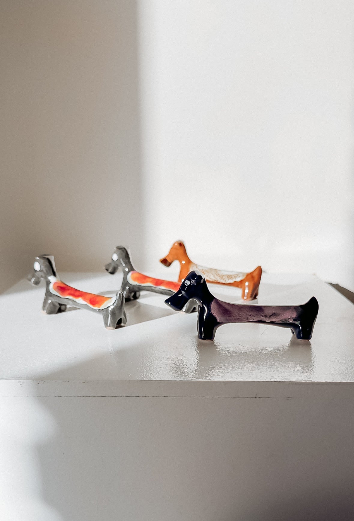 Set handbeschilderde keramieken teckel messenleggers. Handgemaakt in Frankrijk, jaren 60/70. Elk exemplaar heeft dezelfde vorm, maar is geschilderd in een andere kleur. In perfecte conditie. Er zijn 2 sets beschikbaar! Eentje van 4 stuks en eentje van 6 stuks.