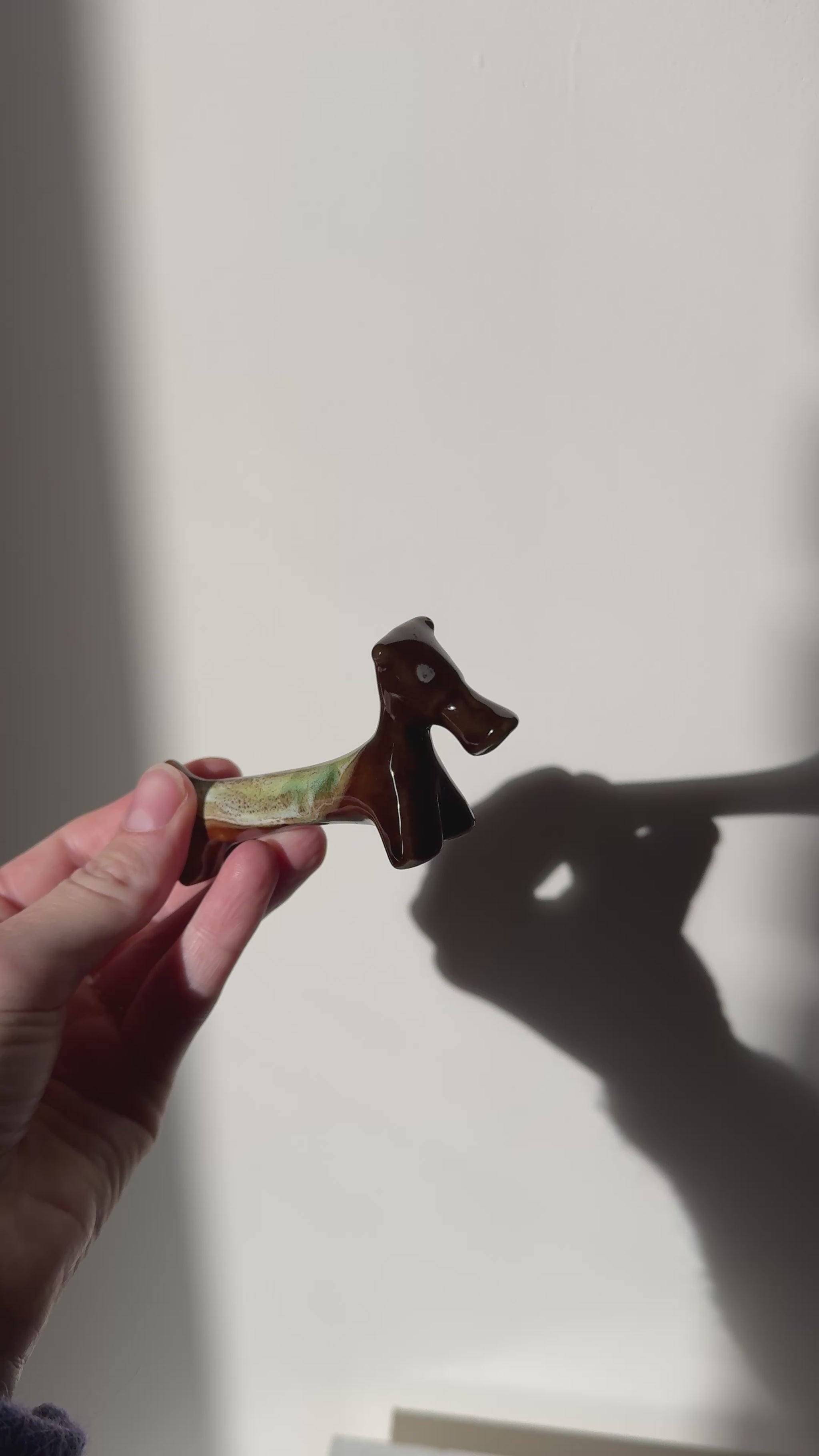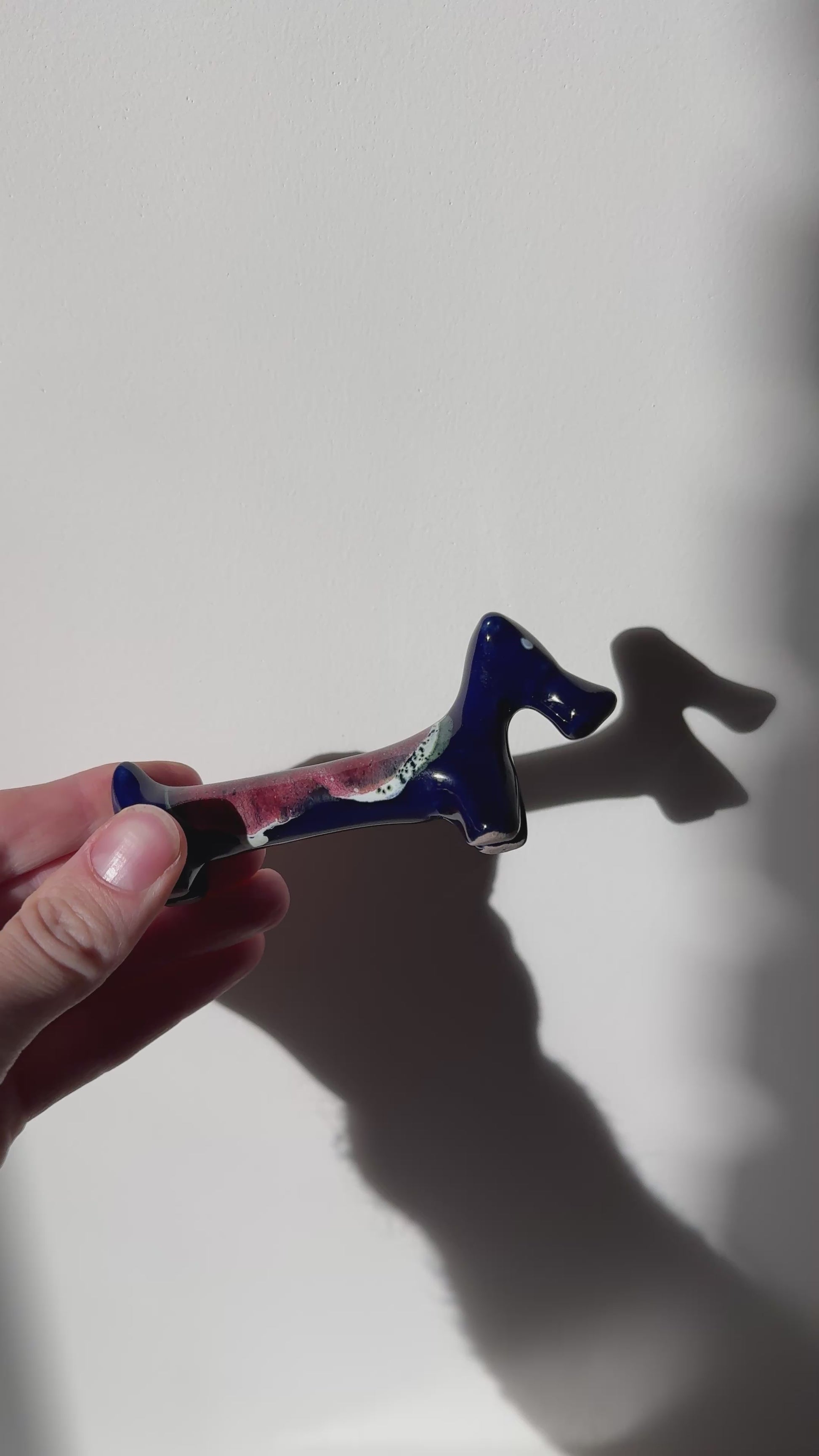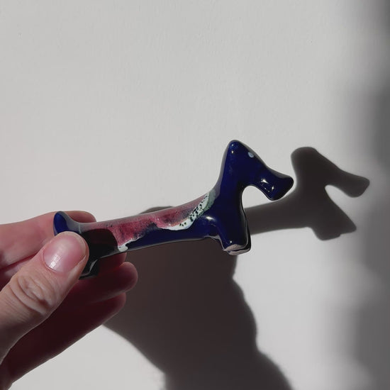 Set handbeschilderde keramieken teckel messenleggers. Handgemaakt in Frankrijk, jaren 60/70. Elk exemplaar heeft dezelfde vorm, maar is geschilderd in een andere kleur. In perfecte conditie. Er zijn 2 sets beschikbaar! Eentje van 4 stuks en eentje van 6 stuks.