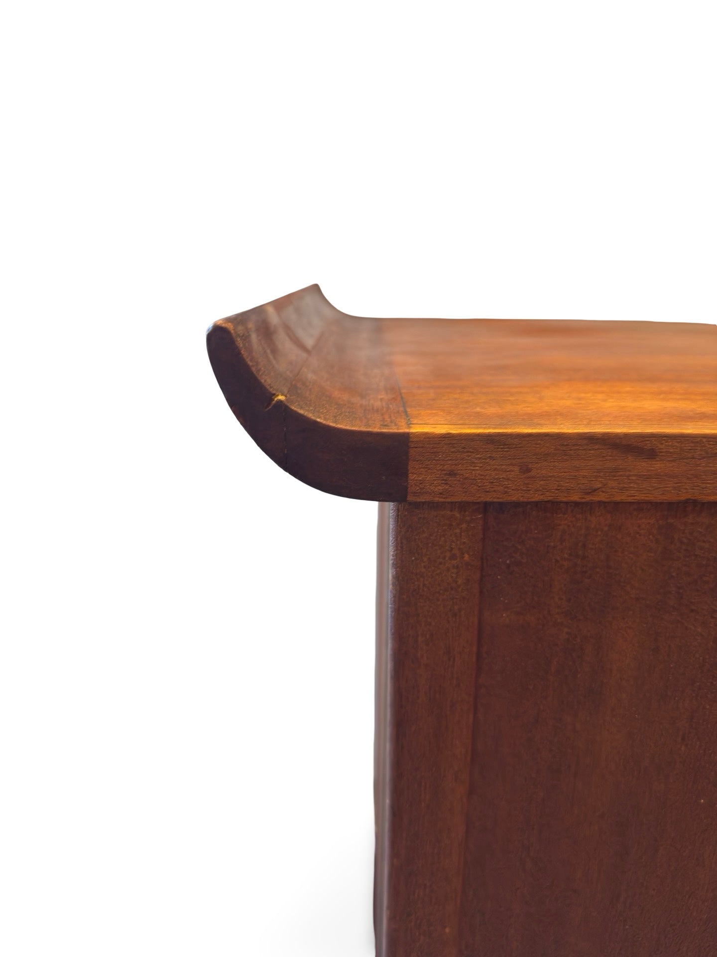 Prachtig groot houten dressoir uit de jaren 50. Dit exemplaar heeft hele bijzondere details, zoals de omhoog gebogen randen, de rond lopende voet en lades en de messing greepjes. Aan de zijkant zitten deurtjes die gebogen open gaan en ook weer mooie details langs de randen hebben.